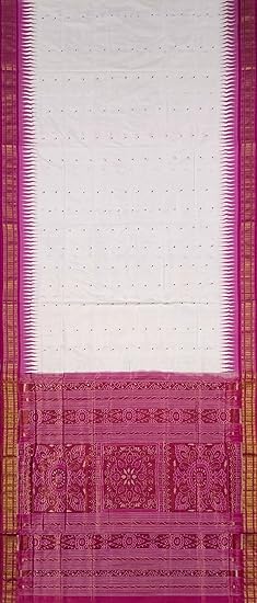 - DESIGN PATTERN: White base saree featuring elegant mini buti design in pink colour, complemented with traditional Sambalpuri patterns on the pallu
